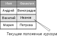 Курсор в объекте базы данных - это “метка”, указывающая текущее местоположение в таблице, т.е.
