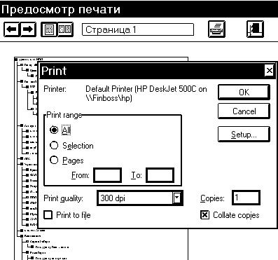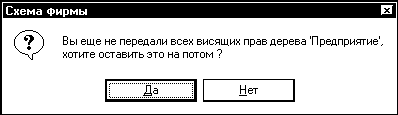 “Повисшие” права (при закрытии структуры)Во время закрытия структуры, если в ней существуют “повисшие” права, то возникает дополнительное информационное окно, предупреждающее Вас, что не все “повисшие” права перераспределены, с предложением оставить операцию перераспределения прав на потом. В случае отказа, операция закрытия структуры будет отменена, и Вы сможете провести все необходимые действия по распределению “прав”. Рисунок 13 Пример диалога Печать “дерева” структуры