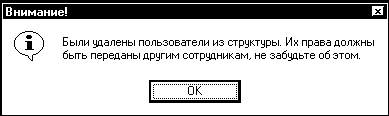 Удаление участников на узлахКак и узел, так и участников на этом узле, при необходимости, возможно удалять. Для выполнения данной операции необходимо установить курсор на необходимый узел и активизировать диалог навигатора. В представленном окне навигатора подразделения, отмените выбор активного пользователя. По закрытию окна навигатора, клавиша ОК, Вам будет выдано предупредительное сообщение, что из структуры были удалены пользователи, и их права должны быть переданы другим сотрудникам. Это говорит о том, что в модифицированной структуре появились “повисшие” права. Понятие “повисшие” права Объекты базы данных могут иметь различный статус. Статус объекта