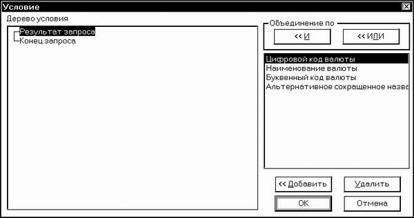 запроса по созданному дереву запросов. Клавиша “Отмена” закрывает диалог построения дерева запросов без выполнения