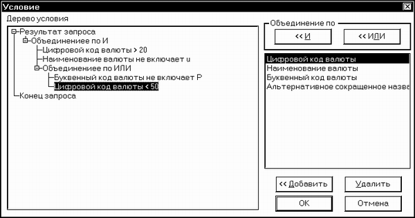 необходимо задать метод объединения требований. Клавиша “Добавить” позволяет включить в дерево запроса выбранный метод
