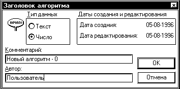 алгоритма и несет в себе описание алгоритма: имя автора, дату создания,