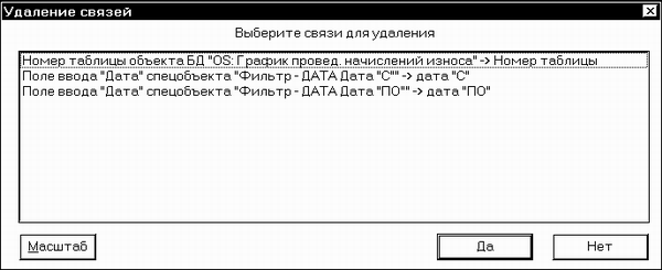 удаление указанных связей. Выход из окна через выбор клавиши - Отмена, не приводит к удалению связей по данным.
