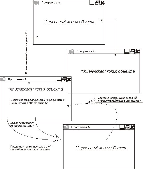 достигается взаимодействие двух приложений через компонент объект взаимодействия использующих единую структуру (ID).