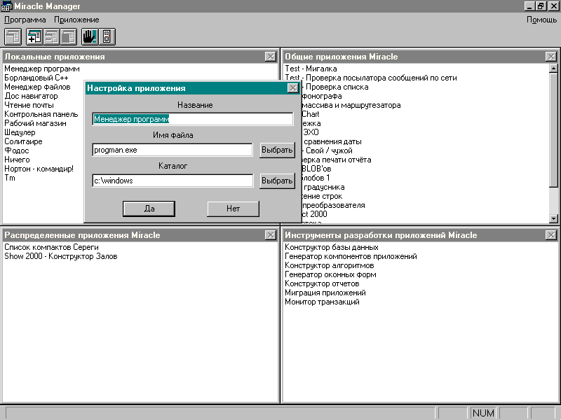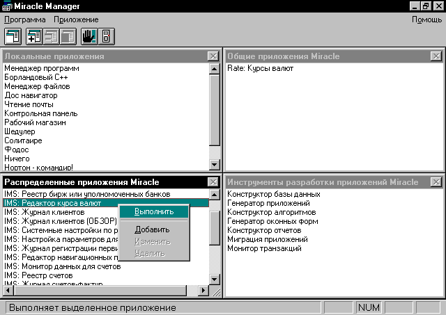 Менеджер осуществляет соединение с сервером управления и предоставляет доступ к разрешенным компанентам для конкретного пользователя. Предоставляется также возможность создания списка локальных приложений для конкретного компьютера локальной сети. Программа может использоваться в качестве основной оболочки Windows, но не полностью заменяет стандартную (нет поддержки DDE).