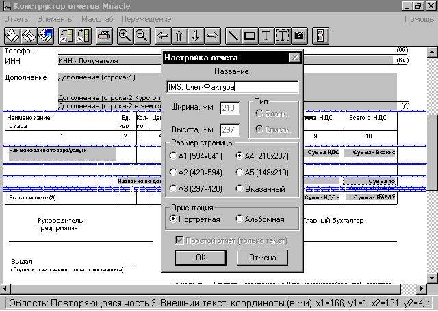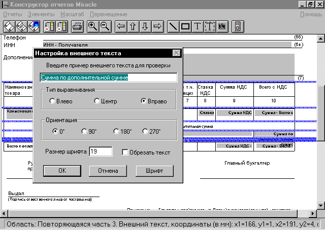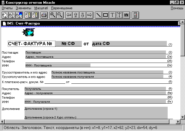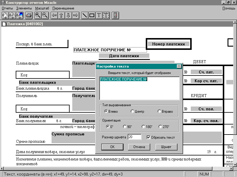 Эта программа предоставляет возможность для вывода наработанных Вами данных на печать. Отчеты бывают двух типов - бланк и список. Примером бланка может служить простое платежное поручение (см.картинку). Этот тип отчетов ничего сложного не представляет. Гораздо сложнее создание отчета списочного типа, в том числе многосписочного с промежуточными результатами. Для создания такого типа отчетов служат специальные программы, например такая широко известная, как Crystal Reports. Эти программы не только создают визуальное представление отчета, но и связывают отчет с базой данных и описывают правила, по которым данные будут выводиться. Система Miracle подразумевает несколько другой подход к созданию списочных отчетов. Конструктор отчетов создает только визуальное представление, вся же логика описывается в приложении, которое будет этот отчет использовать. На первый взгляд это менее удобно, но именно такой подход естественен с точки зрения программиста на Miracle. Ведь таким образом мы не только увеличиваем гибкость управления отчетом, но и разделяем визуальную и логическую часть. Что это дает? Вы можете использовать несколько логик использования одной и той же визуальной формы и в то же время легко менять расположение полей ввода данных на всех отчетах, использующих данную визуальную форму.